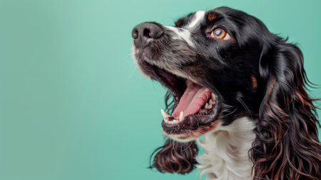 English Springer Spaniel, angry dog baring its teeth, studio lighting pastel background