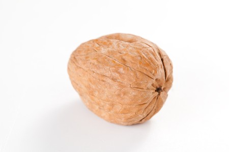 Close-up of open walnut on light surface, resembling brain, with blurred background
