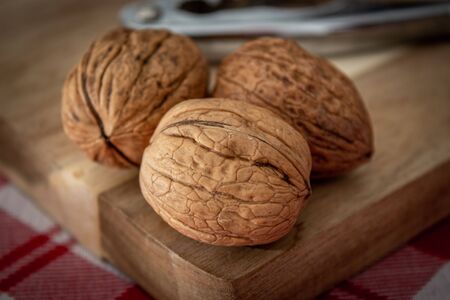 Whole walnuts and nutcracker background. Close up, top view. Harvest concept