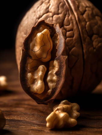 Intimate close-up of the walnut kernel, beautifully highlighting the heart of the walnut. reveals the delicious and nutritious kernel, freshly extracted from its natural husk, showcasing its texture.
