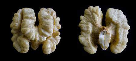 Collage of halves of walnut kernel on black background. One-click selection concept.