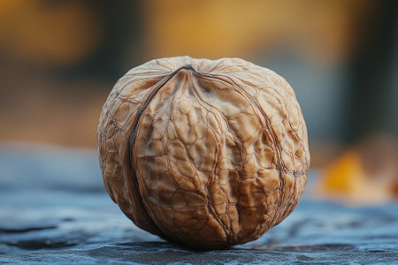 A single walnut sits quietly on a warm wooden table, soaking in the calm atmosphere.