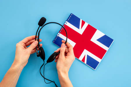 English courses concept. British flag on notebook and headphones