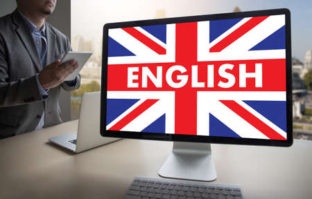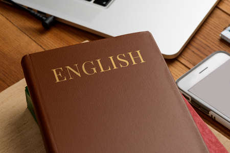Word English on book with United Kingdom flag, learning English language courses concept.