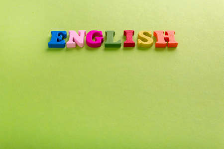 inscription English from colored wooden letters on a gray background, English Language Day