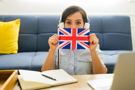 Surprised young woman with headphones excited about learning English online while holding the United Kingdom flag