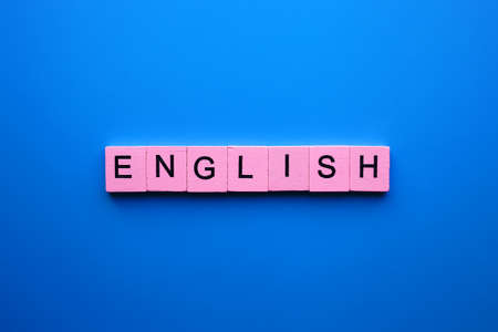 Word english made of lettered wooden blocks on a textured blue stone background