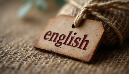 A close-up of a rustic tag featuring the word english embossed in deep red against a textured burlap background. This image evokes a sense of warmth and nostalgia, perfect for themes of language learning, education, or cultural exploration.
