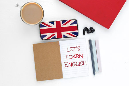Notebook with text let's learn English, smartphone with union jack flag on screen, coffee cup, earphones and pens on white desk, concept education, language school, courses, distance learning
