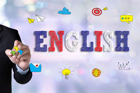 ENGLISH ( British England Language Education ) and Businessman drawing Landing Page on white background