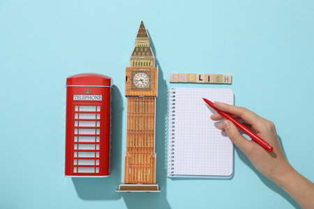 Notepad, Big Ben and the word English on a blue background.