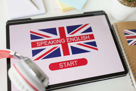 Student table desk with British flag and headphones. Online language courses