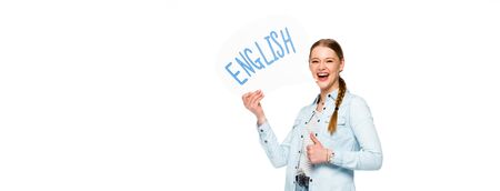 smiling girl with braid holding speech bubble with English lettering and showing thumb up isolated on white, panoramic shot