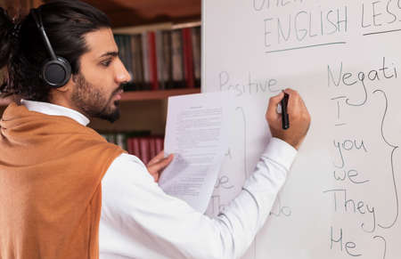 Arab Teacher Man Teaching English Language Writing Grammar Rules On Blackboard Having Online Class Video Lecture Standing Indoors. Tutoring, Distance E-Teaching And E-Learning Concept