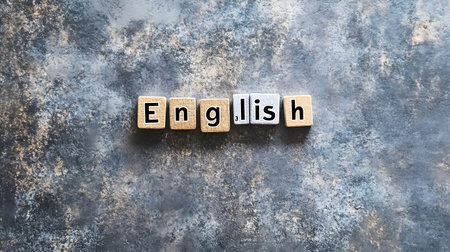 Word english made of lettered wooden blocks on a textured blue stone background