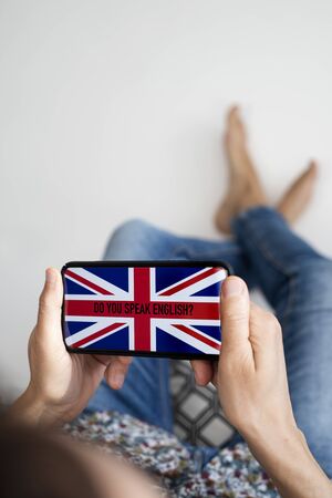 closeup of a young caucasian man, wearing casual clothes, sitting in a chair indoors, having his smartphone in his hand with the text do you speak English and the flag of UK in its screen