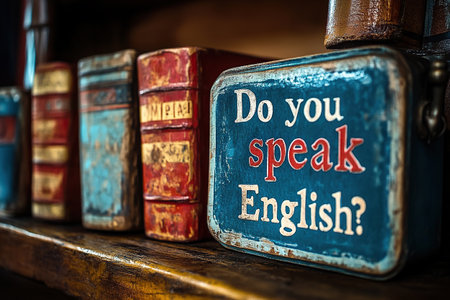 Close-up of a vintage sign reading Do you speak English placed on a wooden shelf among old, worn-out books. The image conveys a sense of nostalgia and historical educational themes.