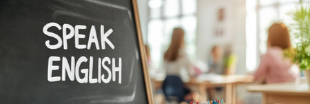 Classroom with blurred students and focus on Speak English sign, education concept, AI Generated
