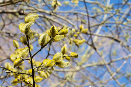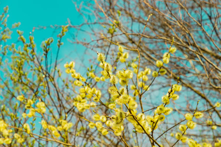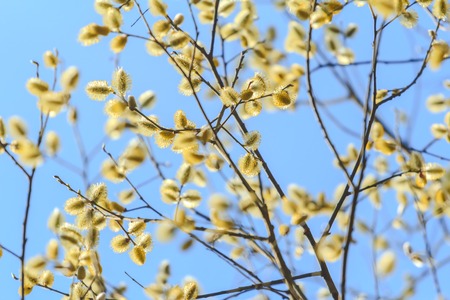 Blooming willow tree twigs with yellow fluffy flowering buds catkins on blue sunny sky background