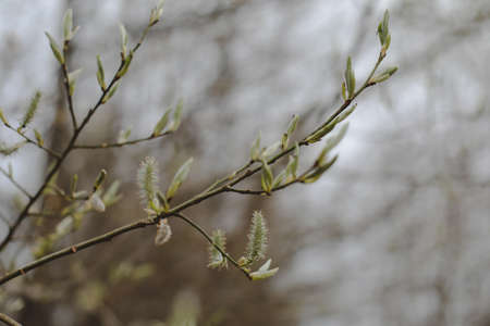 Fluffy catkins on willow tree branch. Beautiful spring natural background. First honey plant in the middle zone.