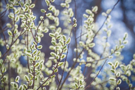 Beautiful pussy willow flowers branches on blue sky background. Soft spring frame with shallow depth of field and bokeh backdrop.
