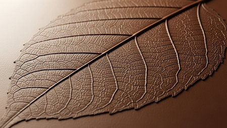 Macro close-up of a brown leaf showing intricate vein patterns and detailed texture.