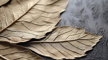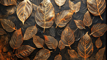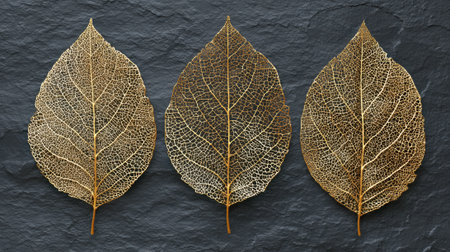 Delicate golden leaves showcase intricate details resting on a dark slate background evoking natures beauty.