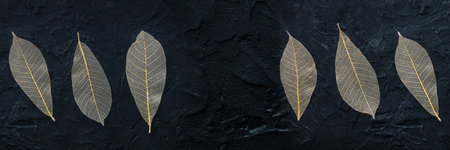 Autumn leaves banner. Skeleton leaves on a black texture. Fall panoramic banner