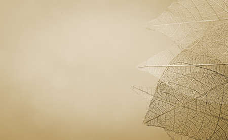Beautiful skeleton leaves on light background, macro view. Space for text