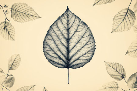 A centered leaf outline in dark green or black stands out against a light gray or white background. Surrounding it are soft illustrations of various leaves, enhancing the minimalist aesthetic.