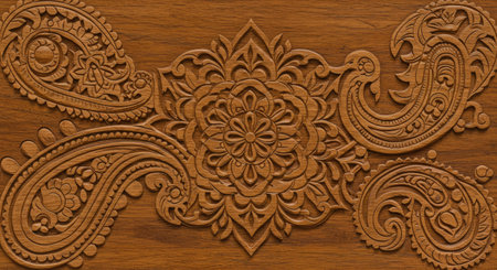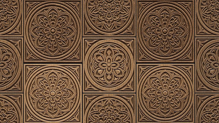 Intricately carved wooden panel with geometric patterns and designs