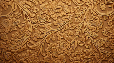 A close-up view of an ornate gold texture featuring an intricate embossed floral pattern. The metallic surface has a rich, luxurious sheen with detailed decorative elements. Clear details and vi...