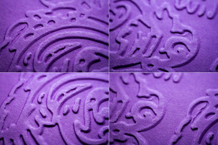 Collection of images with extreme macro of embossed purple paper. Selective focus, shallow depth of field.