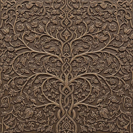 Intricately carved tree of life design on a brown background