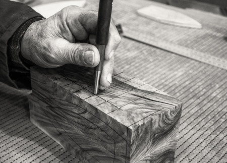 Skilled Artisan Carving Wood in Workshop, Emphasizing Craftsmanship, Attention to Detail, and Handmade Artistry.