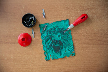 Woodcut Art Printing Equipment for Artist, Wooden Roller, Pencil, Brush, Chisels, Wooden Plate, Mulberry Papers on Wooden Backgroud