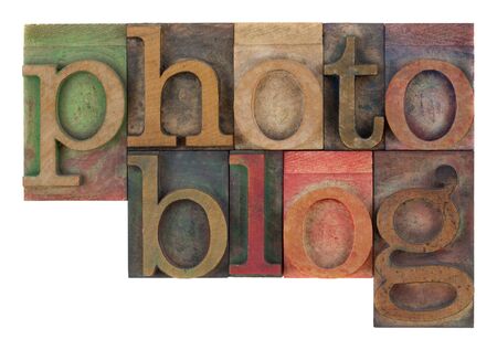 word photoblog in old letterpress wooden type blocks, stained by colorful inks, isolated on white