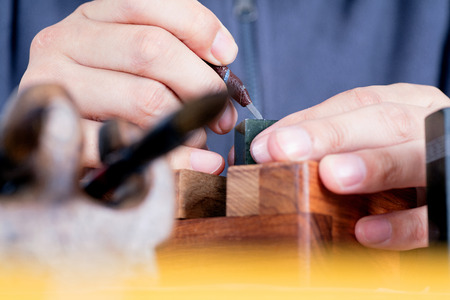 Chiang Mai, Thailand - July 1, 2017: craftsman use a gouge to carve traditional bas-relief on wood at Lanna Expo 2017 in Chiang Mai, Thailand on July 1, 2017.