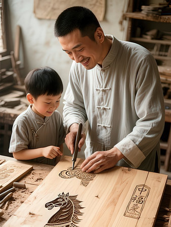Skilled artisan carefully carves elegant symbols into a wooden surface using specialized tools for intricate designs.
