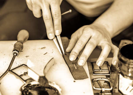 At the cozy studio a leather designer is working on his new project.