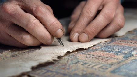 Closeup of hands carefully repairing torn edges of a faded vintage advertising poster using delicate paper restoration techniques.