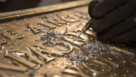 Gloved hand of a skilled artisan meticulously engraving intricate ornate patterns onto a gleaming piece of polished brass, showcasing craftsmanship and precision.