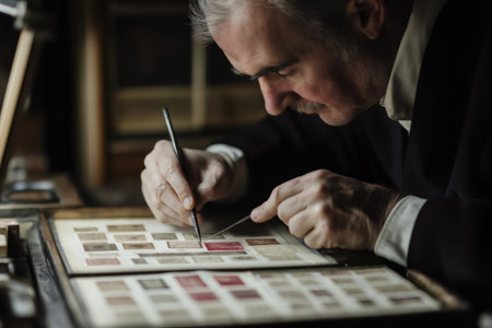 Senior philatelist meticulously arranging a stamp valuable collection, using tweezers and a brush to ensure careful preservation and organization