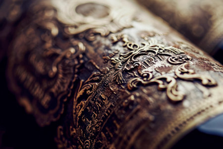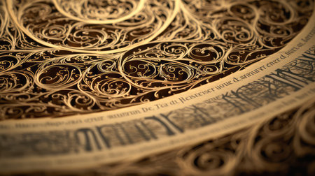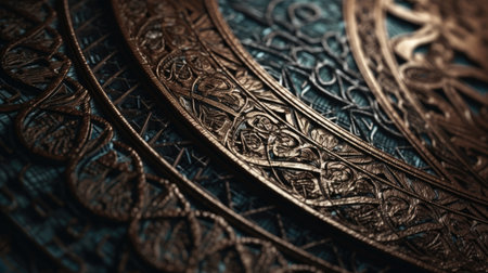 Detailed designs and patterns created from engraving techniques are shown on a dark surface, reflecting a rich historical mood.