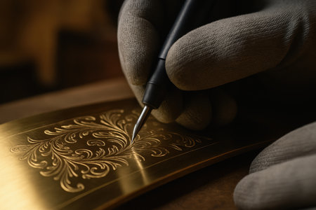 Gloved hand of a skilled artisan meticulously engraving intricate ornate patterns onto a gleaming piece of polished brass, showcasing craftsmanship and precision.