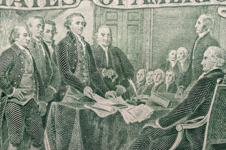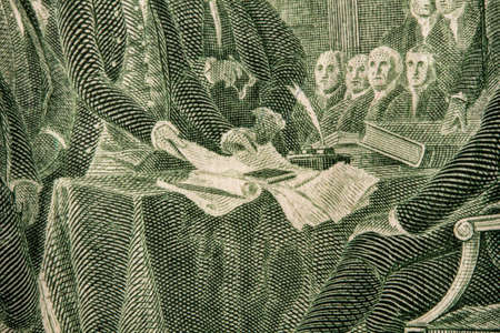 close-up image of a fragment of the Declaration of Independence on the back of a US two dollar bill