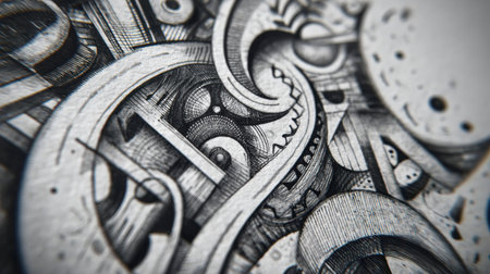 Detailed black and white abstract artwork featuring complex lines, curves, and shapes, creating an engaging visual experience for viewers.