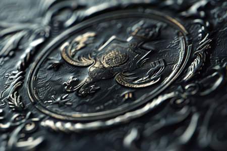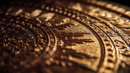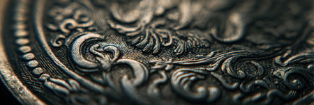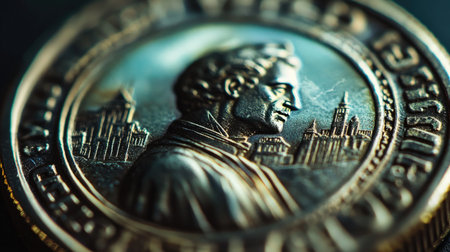 A beautifully engraved coin reveals a regal figure, showcasing intricate designs and textures. Soft light illuminates the metallic surface, highlighting artistry and historical significance.