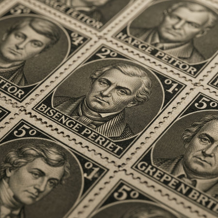A cinematic, extreme macro view of multiple vintage postage stamps showcasing historical figures, re