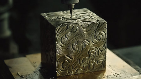 This image showcases a metallic cube with intricate swirling patterns, created through precise CNC machining in an industrial setting, highlighting craftsmanship.